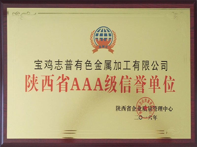 2016年7月,寶雞志普有色金屬加工有限公司被陜西省質(zhì)量管理中心授予陜西省AAA級(jí)信譽(yù)單位。